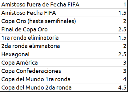 Notarán que la Copa Oro tiene un valor menor que el hexagonal de la eliminatoria. Decidimos hacerlo así ya que en la Copa Oro es común enfrentar rivales muy inferiores como Martinica, Cuba o Bermudas, los cuales nunca llegan a la última ronda de la eliminatoria. En el hexagonal, los rivales más débiles que México suele enfrentar son Jamaica o Trinidad y Tobago, los cuales, aún con su bajo nivel, son mejores que Cuba o Martinica. Por eso, consideramos que el hexagonal tiene un nivel mayor que la Copa Oro.