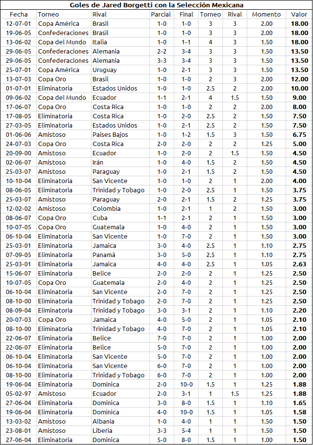 Entonces ¿quién tuvo goles más importantes? Según estos criterios, los goles más importantes de Borgetti fueron ante Brasil en Copa América 2001 y Confederaciones 2005 (ambos para ganar el juego 1-0), y ante Italia para abrir el marcador en el Mundial 2002. Todos ellos dieron 18 puntos.