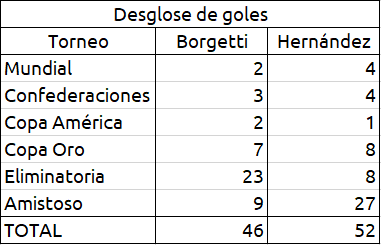 En goles para ampliar la ventaja a dos goles en juegos oficiales está 6-5 a favor de Borgetti, aunque dos de esos goles Hernández fueron en contextos más importantes: contra Japón en la Confederaciones 2013 (marcó doblete en ese partido) y Corea del Sur en el Mundial 2018.